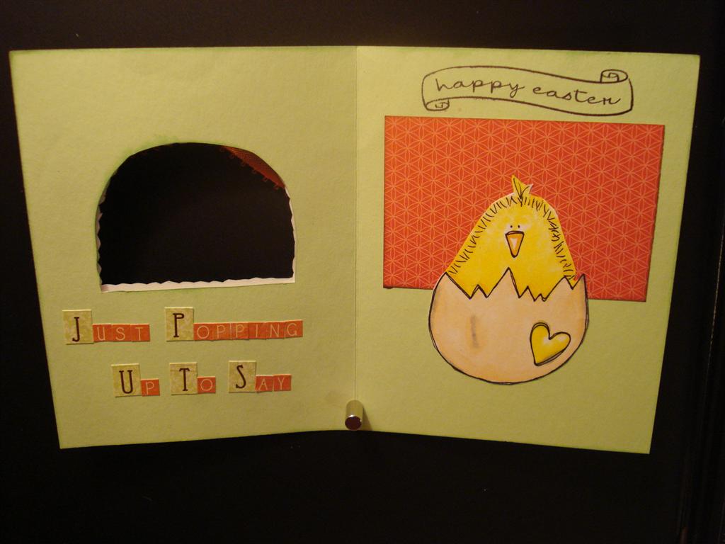 For the inside of the card I wanted to create my own sentiment so I used some darling stickers from Bo Bunny.  Can look up the exact sheet if you would like. ;0)  Behind the chicky I used a gorgeous paper from Stampin' Up because I just really wanted the yellow chicky head to stand out.  I love the combo of those colors together.  I inked my edges and then added the same Michael's stamp and the Dilly Beans Hatching Chicky image.